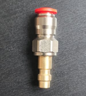 QD han HPA fitting til 6 mm intern slange.Quick disconnect (QD): QDs findes i henholdsvis en han og hun udgave. Hanudgaven sidder på macro hosen eller den interne slange fra enginen, mens hunudgaven sidder på slangen, der kommer fra flasken.
